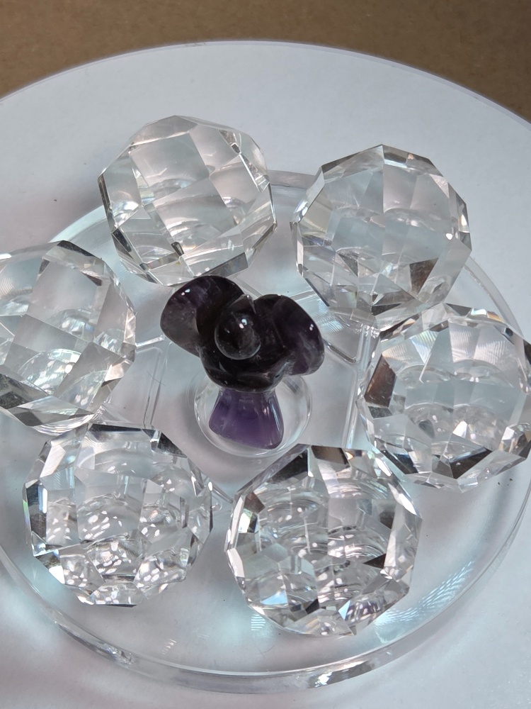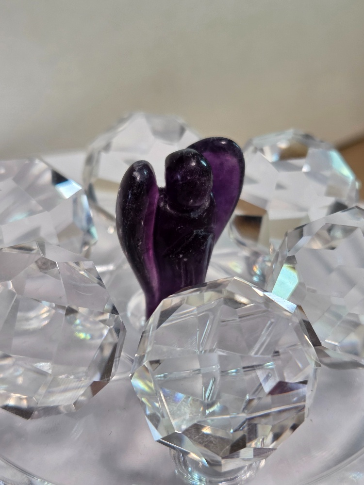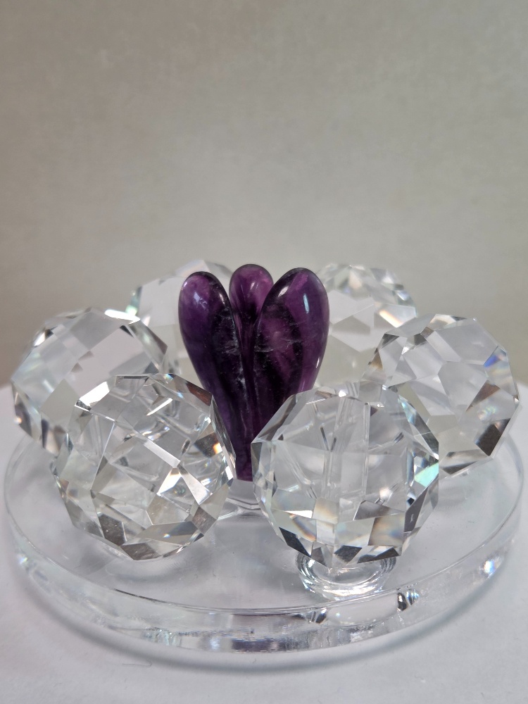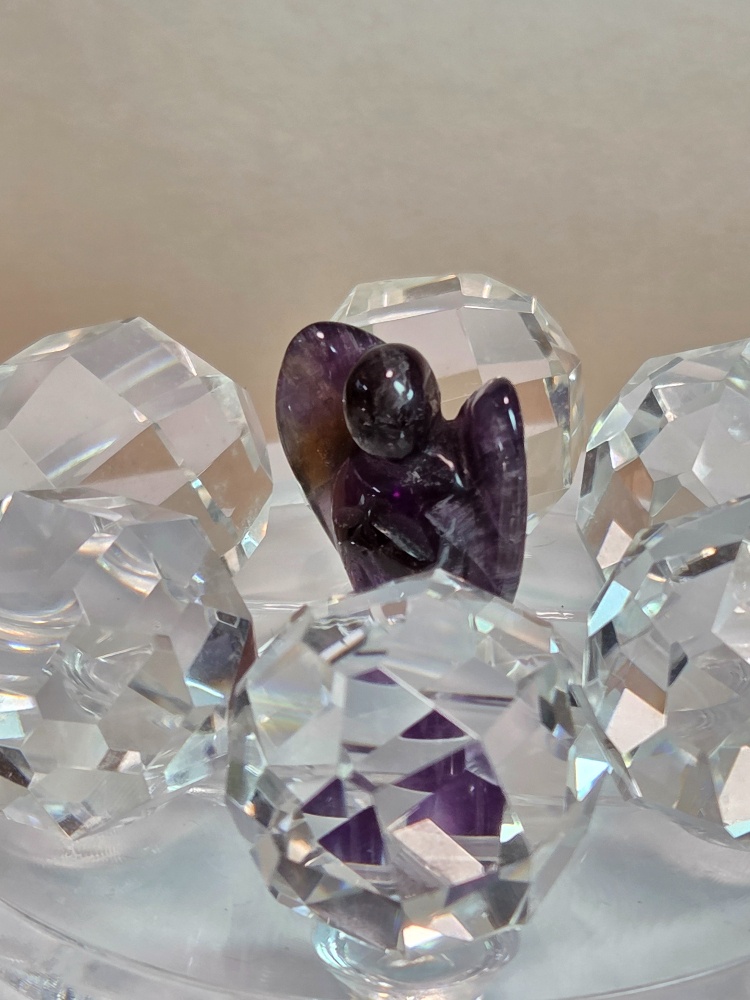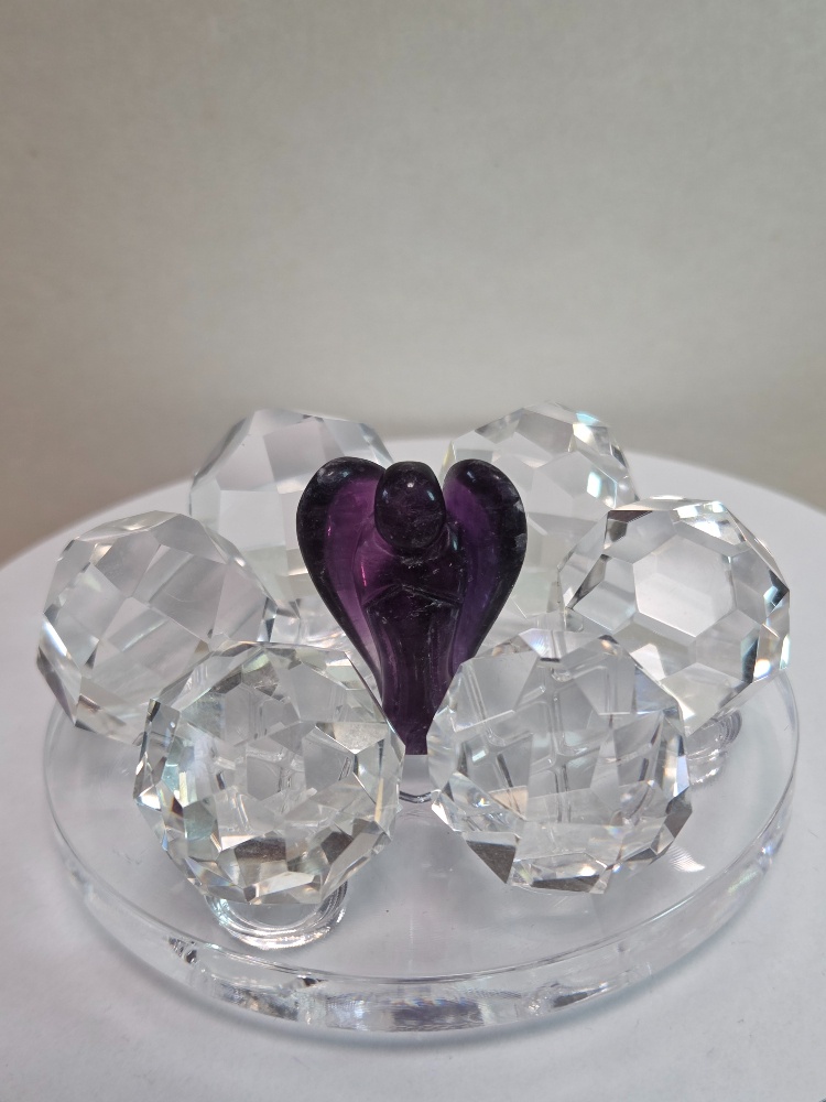 アメジストのエンジェルの回りにヒマラヤ水晶で囲まれた、この配置が持ち主に暖かい家庭と良い気のエネルギーを流して、幸運を呼び込むと云われています。