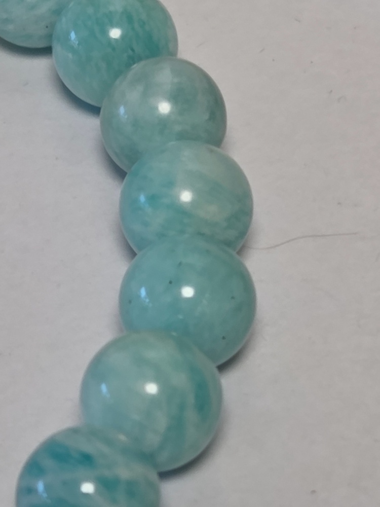 アマゾナイトの青みがかった緑色が柔らかなエネルギーで心を穏やかにすると言われています。