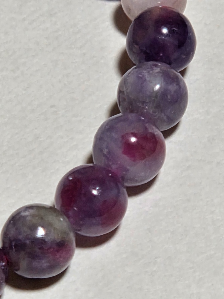 茶色や赤色のインクルージョンがある紫色のアメジストのような外見をしています。